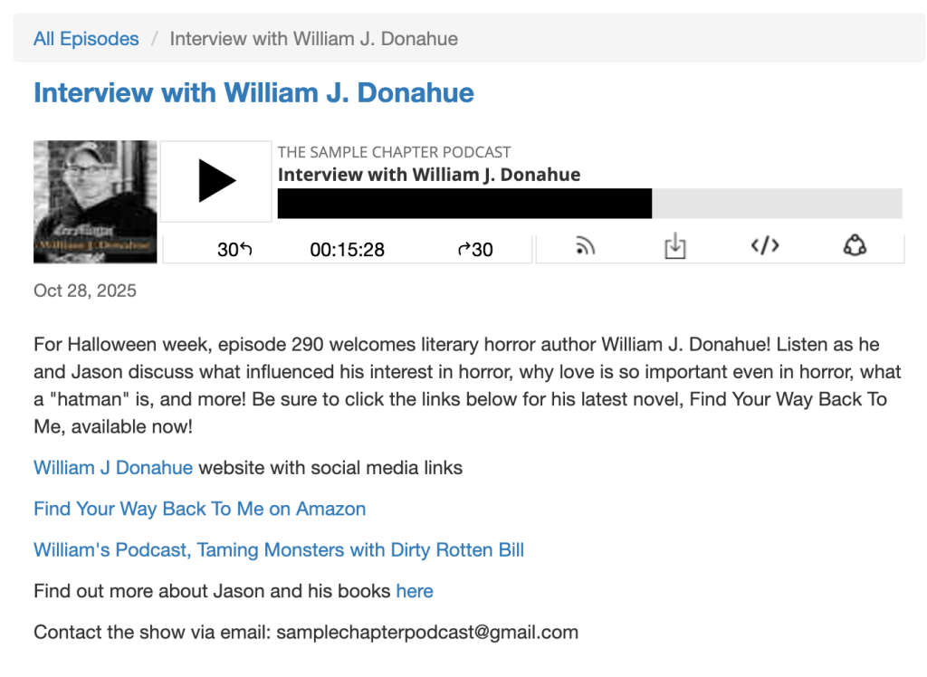 Fellow author and good guy Jason A. Meuschke recently welcomed me onto his rad podcast, The Sample Chapter, to talk about the horror films that scared us (and scarred us), the curious “magic” of storytelling, and why love stories and horror stories go hand in hand. Jason is a fantastic interviewer, and our conversation felt very natural. The following week he brought me back in to read a chapter from my recent novel, FIND YOUR WAY BACK TO ME. Here’s a link to the episode of me reading the novel’s pivotal Chapter 7, “Angels and Devils.”